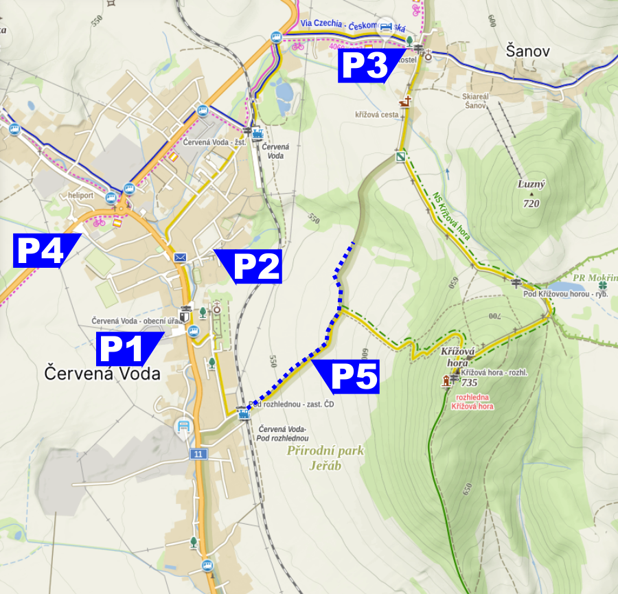 Na Křížovou horu nelze dojet autem (výjimku mají pouze invalidé a držitelé ZTP). První možností je jít pěšky z Červené Vody (parkování č. 1 u Obecního úřadu, č. 2 před kostelem sv. Matouše, č. 4 u nemocnice). Druhá možnost je jít ze Šanova (parkování č. 3 u kostelíku). Obě cesty zaberou 30-60 minut dle svižnosti chůze, délka cca 2 km). Parkovat lze také podél polní cesty, která vede z Červené Vody ke Křížové hoře č.5 - vyznačeno modrými tečkami.